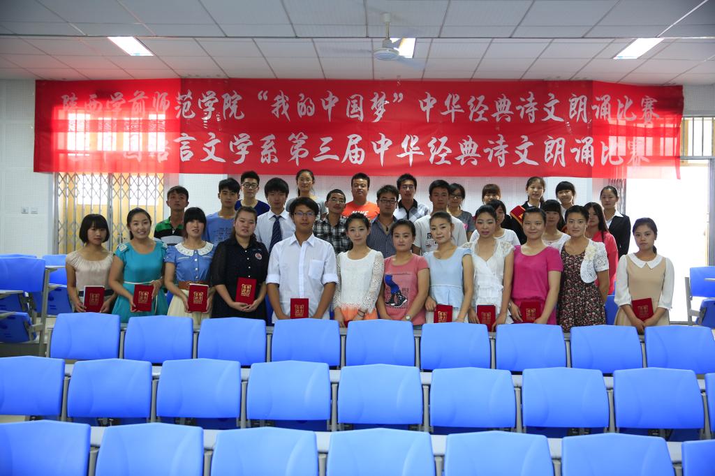 为了响应中共中央鼓励广大青年实现“中国梦”的号召,根据陕西省教育厅《关于举办陕西省教育系统“中国梦•爱国情•成才志”中华诵经典诵写讲系列活动的通知》(陕教语﹝2013﹞2号),落实省教育厅组织中华经典诵读活动的要求,提高广大同学的文学素养,由院普通话水平测试工作站、教务处、学工部、团委主办,中文系承办的陕西学前师范学院“我的中国梦”中文经典诗文朗诵比赛暨中文系第三届中华经典诗文朗诵比赛于5月21日下午在2号教学楼C1音乐表演排练厅圆满落幕。院教务处处长何兆华、学工部副部长刘涛、团委书记汪龙、中文系副书记庞蔚江、部分系党总支副书记、中文系教授韩承红、马晓琴、副教授孙立盎、辅导员等十余名老师出席并担任了本次大赛的评委。
