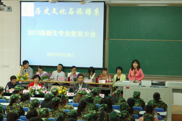 9月28日 ,历史文化与旅游系“2013级新生专业教育大会”在2号教学楼A2教室举行。会上,系主任对新生的到来表示欢迎,并介绍了文化系的历史沿革、师资力量、办学成绩以及培养目标等基本情况。她与新生分享了自己的内心感受,对新生提出期望和要求,鼓励他们要自信、自觉、自立,在今后的大学生活中学有所成、不负年华、收获青春!文化系其他党政领导、教师代表与学生代表也分别做了精彩发言。