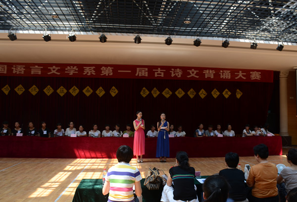 此次大赛主要是在2012级汉语言文学专业的300余名学生当中开展的,由八个班级每个班推选出的四名学生代表参加比赛。大赛共分四个环节,分别是填空必答、个人背诵、集体背诵、击鼓传花。参赛选手在比赛中表现都十分出色,老师们最后的精彩点评也得到了同学们的热烈喝彩。