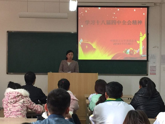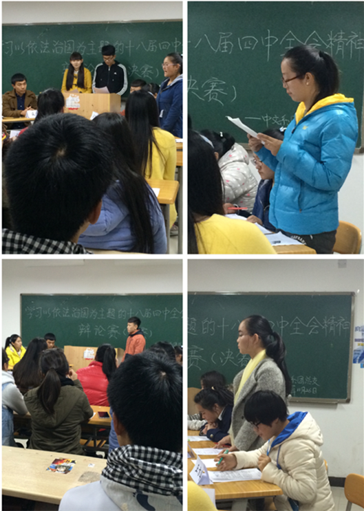 为贯彻学习党的十八届四中全会会议精神,增强学生的法制建设,丰富大学生课余活动,中国语言文学系组织了以依法治国为主题学习十八届四中全会精神的系列活动。