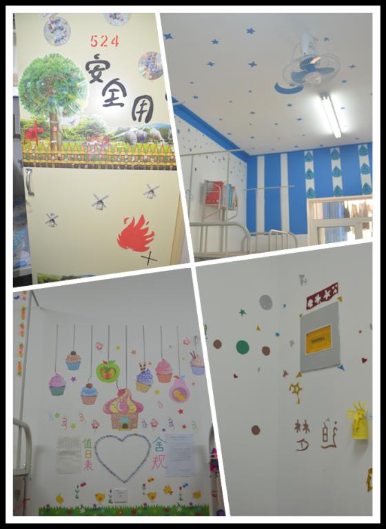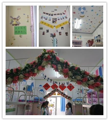 在“美丽宿舍”建设中融入社会主义核心价值观、校训和校风教育,张贴《大学生文明规约》、《宿舍文明行为规范》等制度规范和《语言美、行为美、心灵美、环境美》等标语同时将寝室文化建设作为课堂教学的扩展和延伸,结合幼儿园管理专业室内环境创设专业训练,开展审美教育,增强学生创造力。在“书香宿舍”建设中,以宿舍为单位成立学习小组,开展学习帮带活动,带动全寝室学生提高学习成绩,并开展学习专题讨论、晨读,读专业书籍、环保书籍、道德修养书籍、法律书籍,撰写读书笔记和心得体会。在“环保宿舍”建设中,结合地理专业人文与环境和谐相处的特点,让每个学生树立起安全意识、节约意识、环卫意识,保持宿舍卫生整洁,实行垃圾分类放置、宿舍废物利用,开展文明宿舍卫生大检查、宿舍安全知识竞赛,维护公共环境卫生。