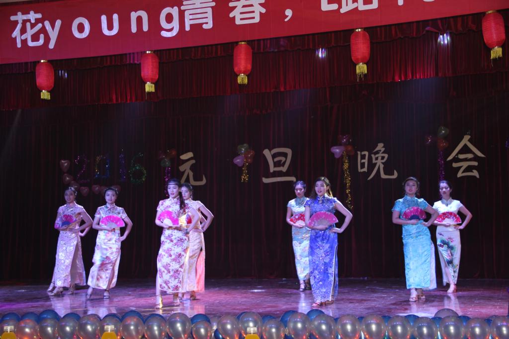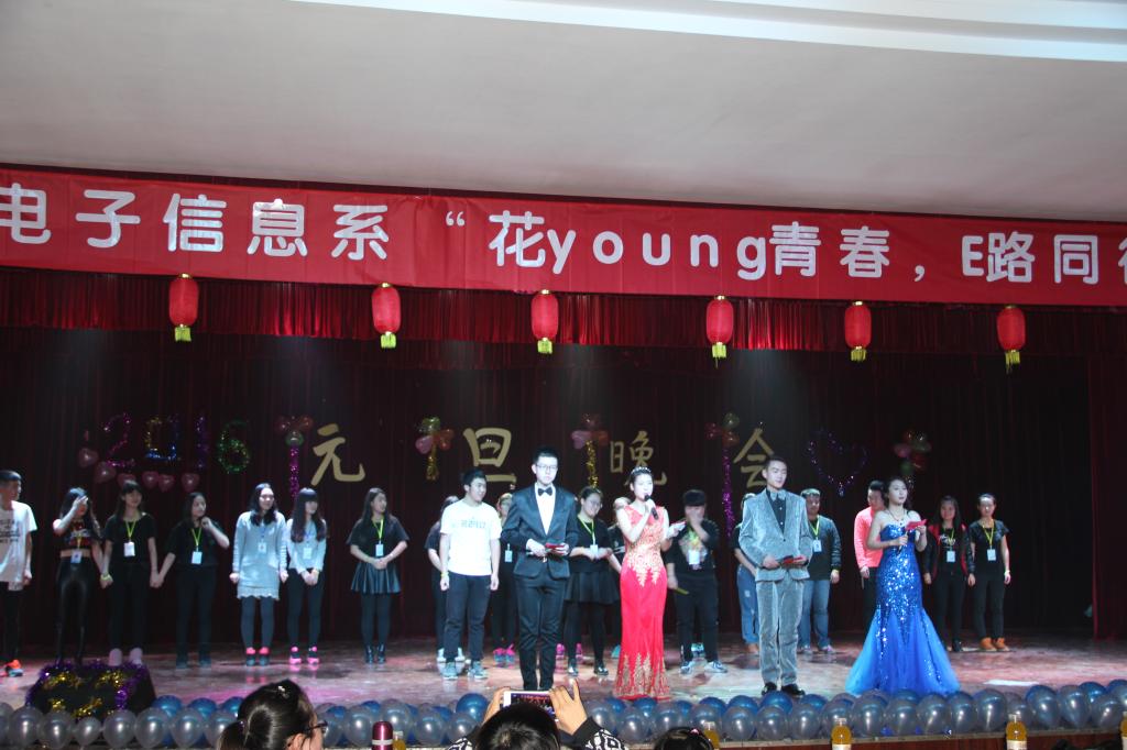 晚会在晚上7点准时开演,4位主持人走上舞台,对到场的各位领导、老师、同学们表示热烈的欢迎,随后在全场观众热烈的掌声中宣布“花Young青春,E路同行”元旦晚会正式开始。