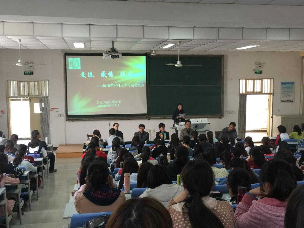 会议首先由文化系2012级历史专业本科班考入西安交通大学和武汉大学的2名优秀学生代表做了考研复习的经验交流,2013级历史专业本科班赴台湾国立台中教育大学的2名学生进行了交换学习的体会和感悟交流,将自己独特的学习方法和所见所闻所想进行深入讲解;接着,校外事办马杰科长就2016年我校学生交换学习的相关政策进行了介绍,对与我校建立了合作关系的院校具体情况进行了详细说明,并为有意愿参加交换学习的学生做了答疑解惑。在学习经验交流之后,文化系党总支书记童广运就我校即将接受省学位办关于新增学士学位授予权审核评估工作,对全体学生做了动员讲话。他对新增学士学位授予权评估审核工作的意义及其对我校的重要性做了全面介绍,对迎接学士学位评估期间学生的上课秩序和纪律及文明礼仪做了严格要求,并希望同学们能从思想上重视,行动上认真践行,以积极良好的状态配合学校共同做好这项工作。文化系主任李岩最后做了总结讲话。首先,她对考研学子和交换学生表示祝贺,祝贺他们进入人生的新阶段,拥有多彩的人生经历和感悟;其次,她希望文化系学子能认真审视和重新思考自己的定位,拿出自身持久力,不断努力进取;最后,她希望学生们能真正学会感恩,用心感恩师长、朋友、家人,学校等,使自身得到升华。