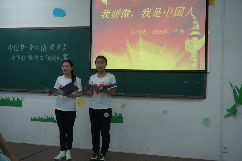 此次比赛共有49组同学参赛,主持人首先介绍了本次比赛的主旨精神和评分标准。选手都进行了充分的准备,有的朗诵《我的祖国》,他们激昂慷慨的朗诵,充满希望、朝气蓬勃,充分展现了我国河山的雄伟壮阔,描绘了源远厚重的五千年的历史文化;有的朗诵岳飞的《满江红》,抒发了作者满腔忠义、为国立功的豪情壮志;还有的朗诵戴望舒的《残破的手掌》、《雨巷》等,表达了同学们对祖国的热爱,对中国梦的解读以及对未来美好生活的向往。