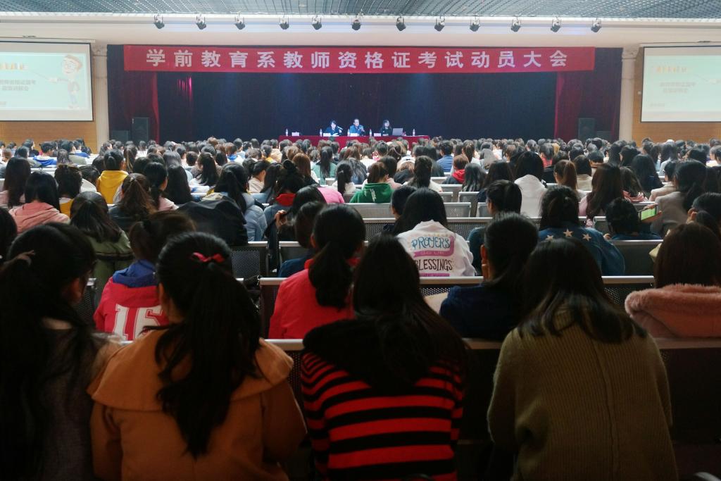 2017年3月29日中午,学前教育系在校大学生活动中心针对2015级学生召开了教师资格证考试动员大会。参与此次活动的有学前教育系党总支书记、副书记、2015级辅导员老师和学前教育系2015级本专科全体学生,讲座由新智教育集团教师资格证考试培训专业教师主讲。