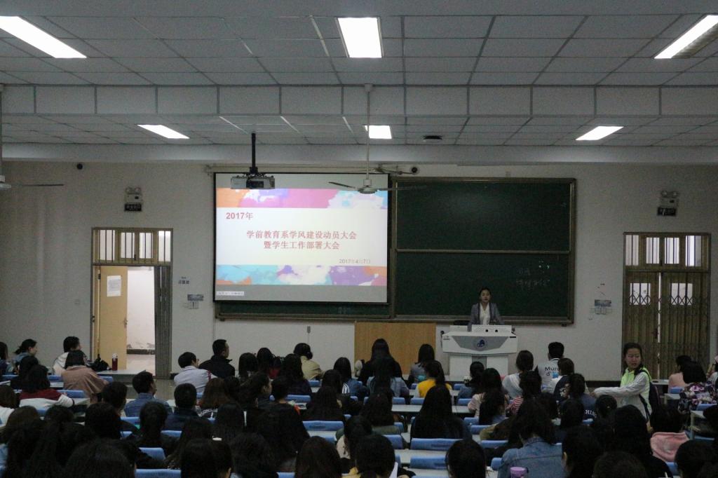 学前教育系于4月7日中午在1号教学楼B1教室召开了2017年学风建设动员暨学生工作大会,学前教育系党总支副书记、全体辅导员及全体学生干部参加了动员大会。