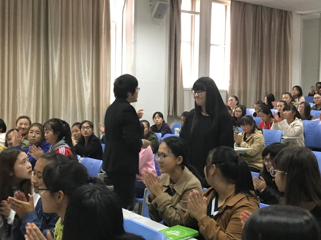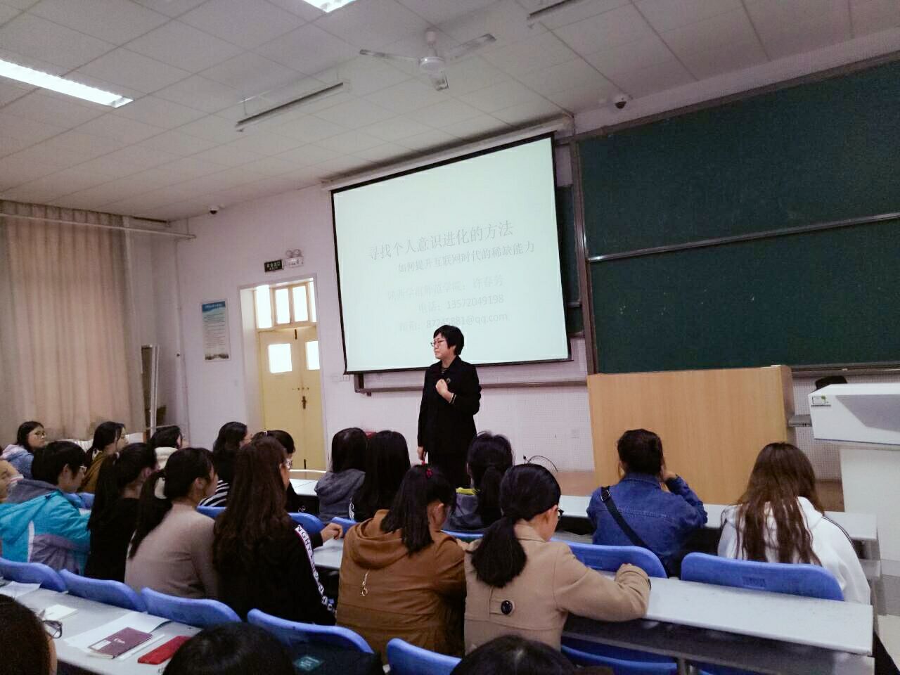 许春芳教授从发现和寻找自己的心智盲区、觉察个人的意识进化、开启向未来学习的模式三个方面进行讲述。“提升互联网时代的稀缺能力”,即处理好人与物、人与人、人与自己的关系,察觉时代的变化,认清个人与组织和系统的关系,学会成长、学习、自我察觉,并看清并解决自我的盲区。一个人一定要学会自我察觉,才能明白自己想要的未来是怎样的,自己要走的是怎样的路。讲堂以趣味互动的形式展开,在讲故事、学生问答、自我测试等活动的过程中,同学们的兴趣被极大地调动,使得课堂气氛更加活跃。最后许春芳教授还向数学系全体学生推荐了《U型理论》、《U型变革》、《三重专注力》等书籍,她期望数学系全体学生能形成正能量的三观和与时俱进的思维方式。