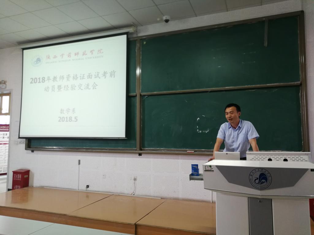 5月2日下午3:30,数学系在2教C2举行2018年教师资格证面试考前动员暨经验交流会。数学系党总支副书记王继康、陕西师范大学副教授张春雨、辅导员宋鹏瑶、优秀学生代表及2015级、2016级通过教师资格证笔试的全体学生参加了本次交流会。会议由辅导员宋鹏瑶主持。