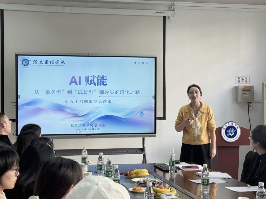 为深入贯彻全国教育大会精神,落实立德树人根本任务,提升辅导员数字化育人能力与职业素养,12月4日,由党委学工部主办、信息工程学院承办的第五十六期辅导员沙龙在积学楼A204举行,活动由学院党委副书记常海滨主持。本期沙龙以“AI赋能:从‘事务型’到‘成长型’辅导员的进化之路”为主题,由信息工程学院辅导员李倩主讲,各学院辅导员代表参与研讨。