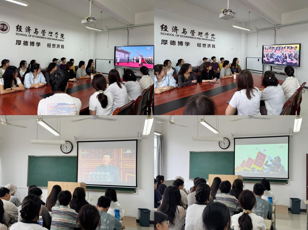 为弘扬伟大抗战精神,厚植师生爱国情怀,9月3日上午,经济与管理学院在博文楼b411会议室、b508教室组织师生集中观看纪念中国人民抗日战争暨世界反法西斯战争胜利80周年大会现场直播,共同见证庄严时刻,凝聚奋进力量。