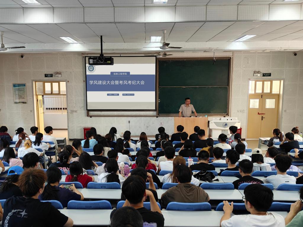 为进一步加强学院学风建设,严肃考风考纪,营造良好的学习氛围,信息工程学院于2025年6月12日在积学楼B2召开了学风建设大会暨考风考纪大会。各年级学生干部、违纪处分学生和其他学生代表共160 余人参会,会议由信息工程学院党委副书记常海滨主讲。