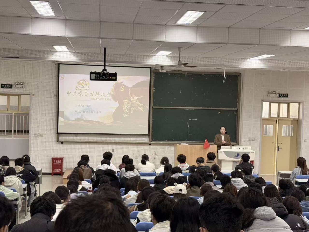 10月28日,数统院学生党支部书记何静以“追寻信仰之光,筑牢信念之基”为题讲授专题党课,结合党的百年奋斗历程,生动阐释“中国共产党为什么能、马克思主义为什么行、中国特色社会主义为什么好”的深刻内涵。随后她系统解读党员发展标准、入党申请撰写规范及全流程培养考察要求,通过典型案例拆解与常见问题答疑,让新生清晰掌握“为什么入党、入党做什么、为党留什么”的核心答案,打消思想困惑、明确努力方向。