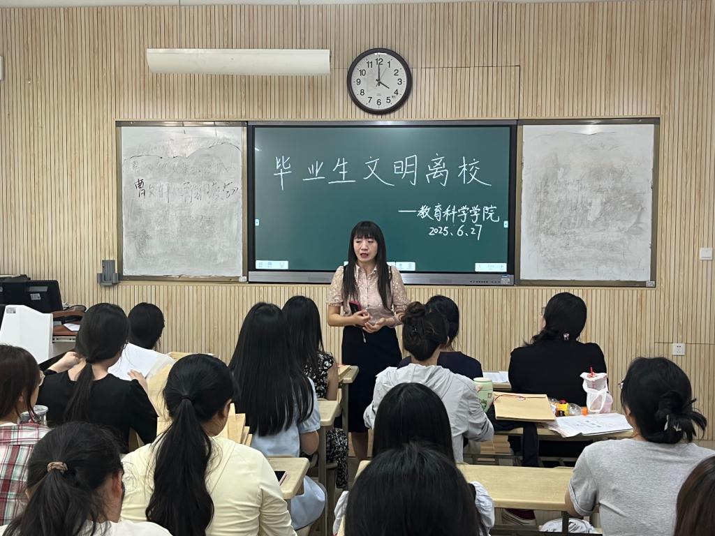 6月27日下午,教育科学学院在A201教室举行2025届毕业生文明离校教育。学院副书记张晔及毕业班辅导员、全体毕业生参加了本次教育讲座。